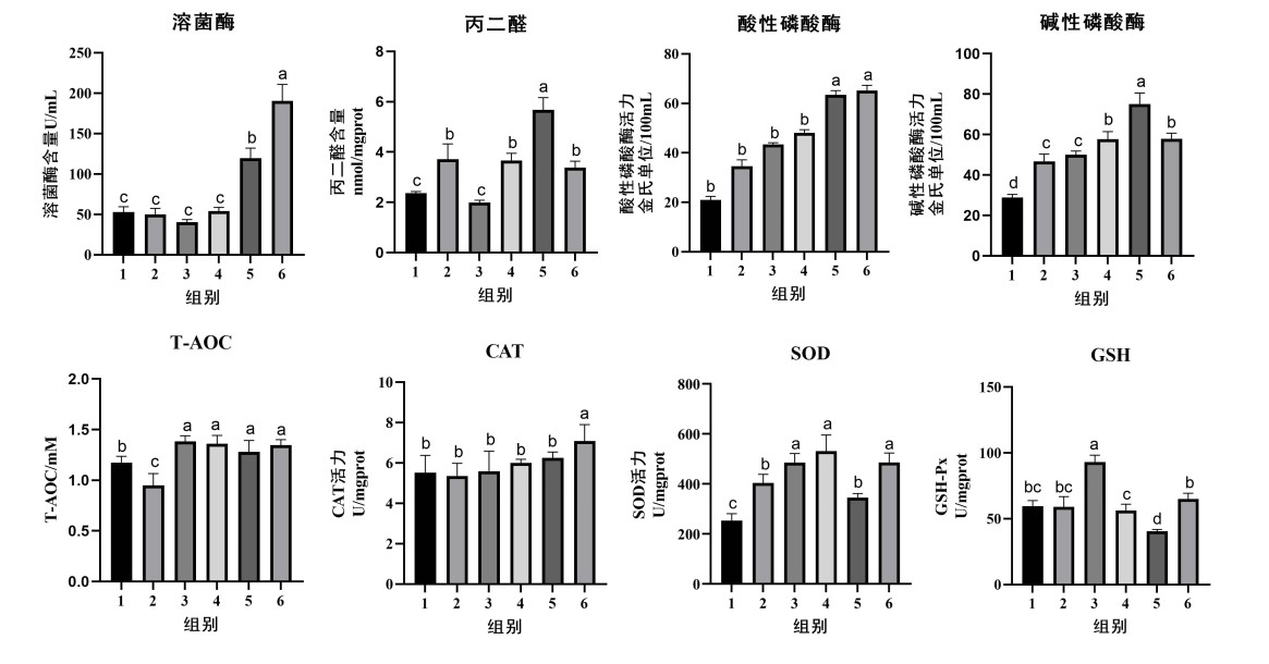 大豆异黄酮对南美白对虾生长与肝胰腺健康的影响发表时间:2025-07-10 10:08 大豆异黄酮对南美白对虾生长与肝胰腺健康的影响 王胜林1,2,霍星华2,孙静2,刘坚2,李艳芳2,曹秀表2 广东省农业科学院动物科学研究所,广东新南都饲料科技有限公司 摘要:本研究旨在研究添加不同剂量的大豆异黄酮对南美白对虾生长和肝胰腺健康的影响。在基础试验饲料中添加0、100、200、300、400、500克/吨益健素(含1%大豆异黄酮),配制成6种不同的试验饲料,其中,第1组为对照组,第2-6组分别为试验1-5组,对南美白对虾进行为期 56天的养殖试验,检测其生长性能、血清生化指标、肠道与肝胰腺消化酶活性以及肝胰腺免疫与抗氧化能力。结果表明:(1)生长性能指标显示,试验各组南美白对虾的生长指标无显著影响(P>0.05),但试验1-5组的末均重、增重率、特定生长率等指标均略高于对照组;试验1-5组的饲料系数和摄食率均略低于对照组。(2)血清生化指标显示,试验1-5组的谷丙转氨酸ALT含量均低于对照组,试验1组的谷丙转氨酸ALT含量显著低于其他试验各组(P<0.05),试验5组的谷草转氨酶AST含量显著高于其他试验各组(P<0.05);试验1-4组的总蛋白TP和球蛋白GLB含量均高于对照组和试验5组,试验2组的总蛋白TP和球蛋白GLB含量显著提高(P<0.05);血脂指标显示,试验各组与对照组无显著差异(P>0.05),试验1组高于对照组和其他试验各组。(3)肠道与肝胰腺消化酶活性显示,与对照组相比,第4组(试验3组)肠道胃蛋白酶和胰蛋白酶水平显著提高(P<0.05),试验2、3组胰蛋白酶水平显著提高(P<0.05),试验2、4、5组脂肪酶活性显著提高(P<0.05);试验1-5组肝胰腺胃蛋白酶均高于对照组,试验1-5组胰蛋白酶均低于对照组,试验1-4组肝胰腺的脂肪酶活性均高于对照组,试验1组最高(P<0.05)。(4)免疫及抗氧化相关指标所示,与对照组相比,试验4、5组肝胰腺的溶菌酶和酸性磷酸酶的含量显著提高(P<0.05),验4组的碱性磷酸酶含量显著增加(P<0.05),试验2-5组的T-AOC和SOD酶活性显著增加(P<0.05),各组的CAT含量无显著差异(P>0.05)。综上所述,添加不同剂量大豆异黄酮(100-500克/吨益健素)能促进南美白对虾的生长,同时对肠道与肝胰腺健康有一定的改善作用(具体结果见下表2-3和图1-3)。 关键词:南美白对虾;大豆异黄酮;生长性能;血清生化指标; 消化酶活性;抗氧化能力 大豆异黄酮是豆粕中主要的植物雌激素,对动物包括人类,畜禽类和鱼类等均具有潜在的生物学作用。因为大豆异黄酮具有雌激素样/抗雌激素样和抗病力的作用,1990年以来大豆异黄酮在世界范围内获得了广泛关注。在畜禽类中,大豆异黄酮通常作为促进生长和提高繁殖性能的添加剂而广泛应用在饲料中。但是,在水产动物中关于大豆异黄酮的研究报道比较少,而且目前在水产动物中大豆异黄酮相关的研究结果之间差异也比较大。关于大豆异黄酮对南美白对虾的生长、肠道健康与肝胰腺功能的影响的研究,目前还没有报道。因此,本实验通过在饲料中添加不同剂量的大豆异黄酮,研究其对南美白对虾的生长性能、消化酶活力、肠道与肝胰腺功能的影响。 1. 材料与方法 本试验共设置6个组,对照组采用基础试验饲料,实验1-5组分别在基础试验饲料中添加100、200、300、400、500克/吨益健素(含1%大豆异黄酮,由广东新南都饲料科技有限公司提供),基础试验饲料配方和营养水平见表1。 表1 基础试验饲料配方和营养水平